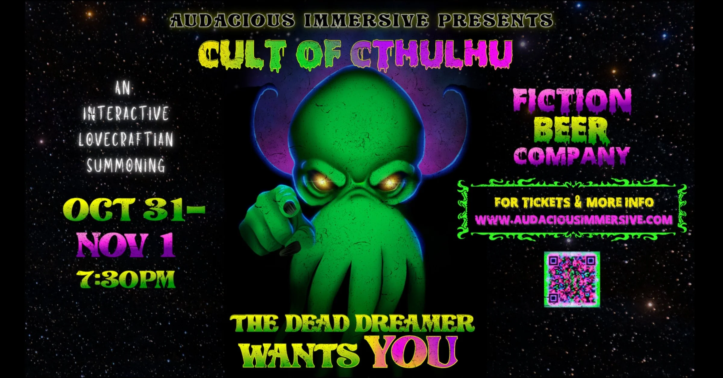 This Halloween season, "Cult of Cthulhu" transforms the chilling tales of H.P. Lovecraft into a campy, interactive horror comedy. Part theatre, part ritual, part satire — audiences are invited to join rival cults, participate in eldritch ceremonies, and laugh nervously in the face of cosmic dread.