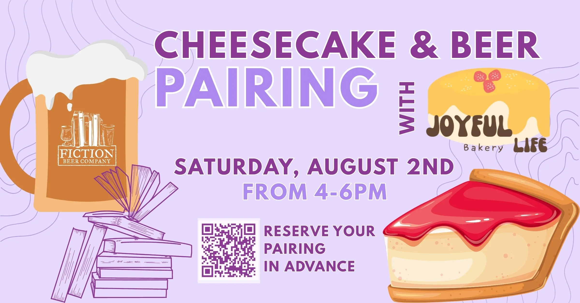 Join us for a deliciously unique tasting experience at Fiction Beer, where flavor meets craftsmanship! Enjoy three handcrafted cheesecakes from Joyful Life Bakery, each thoughtfully paired with a specially selected craft beer.