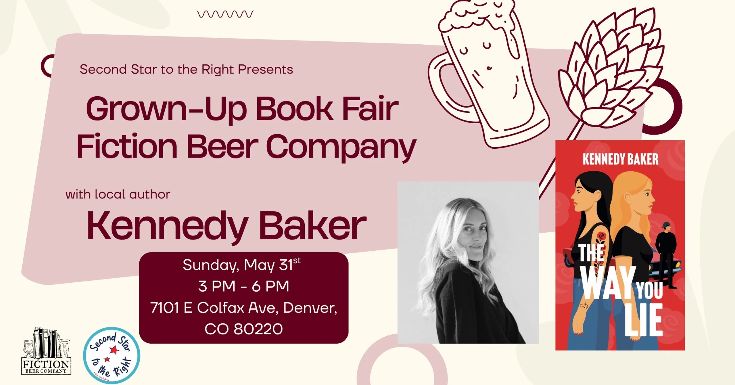 Back to All Events Grown-Up Book Fair w/ Second Star to the Right Sunday, May 31, 2026 3:00 PM 6:00 PM Google Calendar ICS Join us for our monthly Grown-Up Book Fair with Second Star to the Right featuring local author Kennedy Baker. Great books, craft beer, and all the nostalgic vibes—what’s not to love? Go to the Facebook Event Go to the Facebook Event