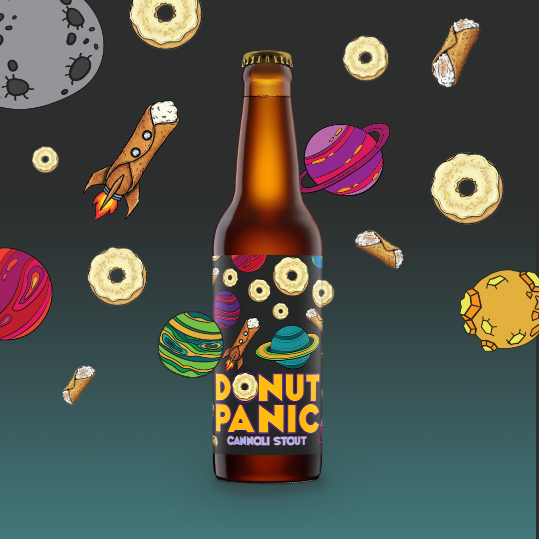 For Donut Panic, we used our Stout recipe, made with Carafa Special III malt, and added our brewer’s favorite dessert in the whole galaxy: cannolis. We then added lactose for creaminess, cinnamon, vanilla, and a hint of lemon to make you feel like you are right in a New York City pastucceria, no matter where you’re hitchhiking in the universe.